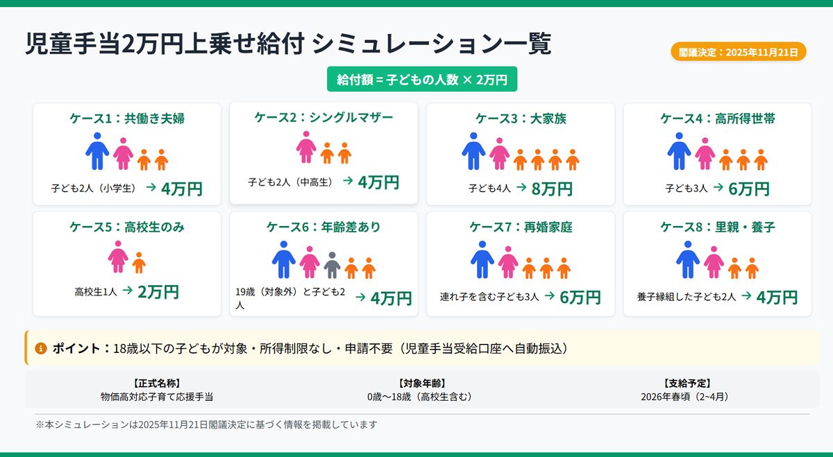 2025年11月21日に閣議決定された児童手当2万円上乗せ給付について、家族構成別にいくらもらえるのかシミュレーションします。子ども1人あたり2万円、所得制限なし、申請不要で2026年春ごろ自動振込予定です。