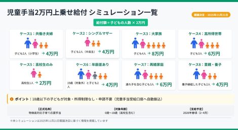 児童手当2万円上乗せ家族構成別金額シミュレーション 公開日: 2025.11.22 最終更新日: 2025.11.22 こちらの画像は、下記の記事で詳しく解説しています↓ 2026年最新|児童手当2万円上乗せ給付いくらもらえる?家族構成別シミュレーション LINE友達に追加