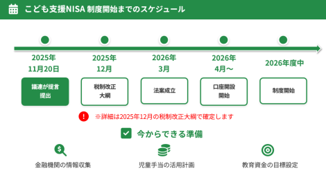 こども支援NISA 制度開始までのスケジュール 公開日: 2025.11.22 最終更新日: 2025.11.22 こちらの画像は、下記の記事で詳しく解説しています↓ こども支援NISAとは?0歳から始める非課税投資制度を徹底解説 LINE友達に追加