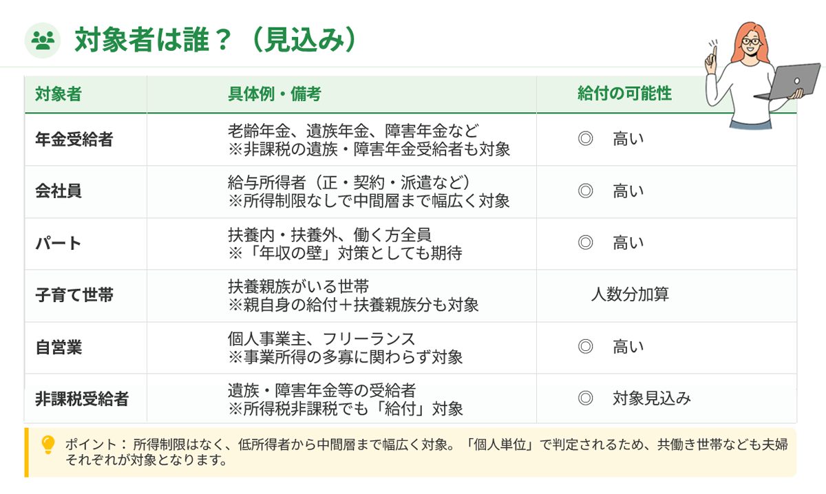 A. 年金受給者、会社員、パート・アルバイト、子育て世帯、フリーランス、遺族年金・障害年金受給者など幅広い層が対象となる見込みです。