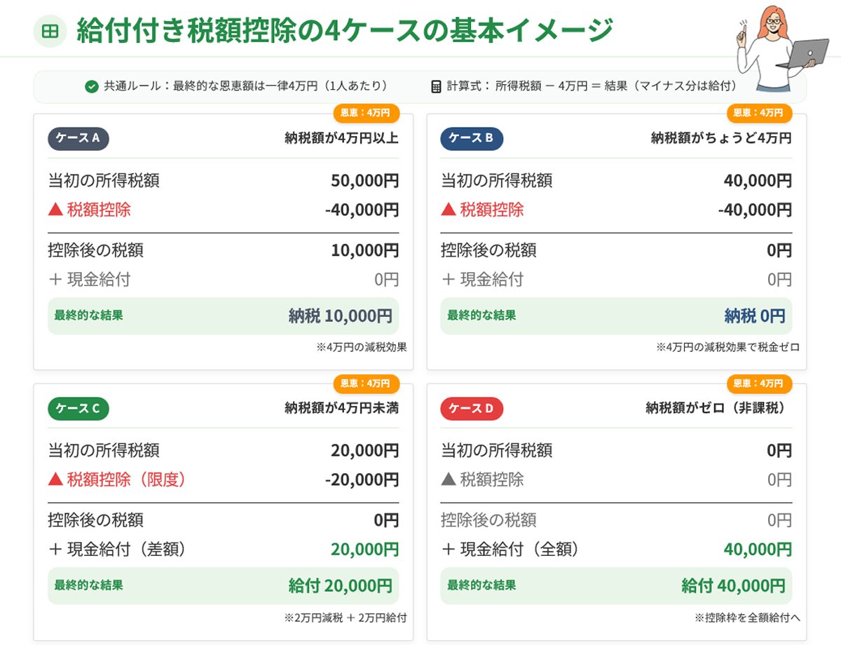 - 全ケースで恩恵は4万円:納税額に関わらず、最終的な恩恵は一律4万円