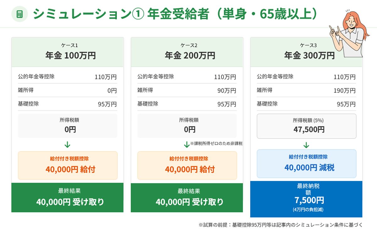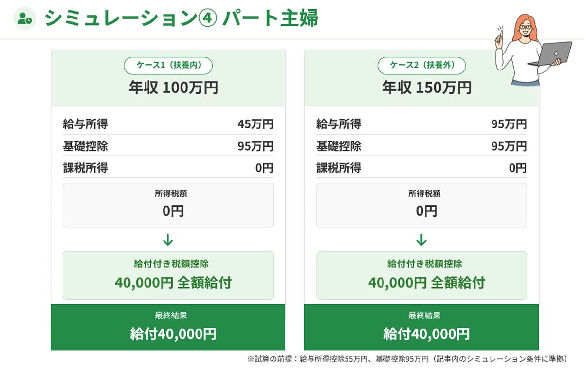 結果:所得税は非課税。給付付き税額控除により4万円の現金給付を受け取れます。
