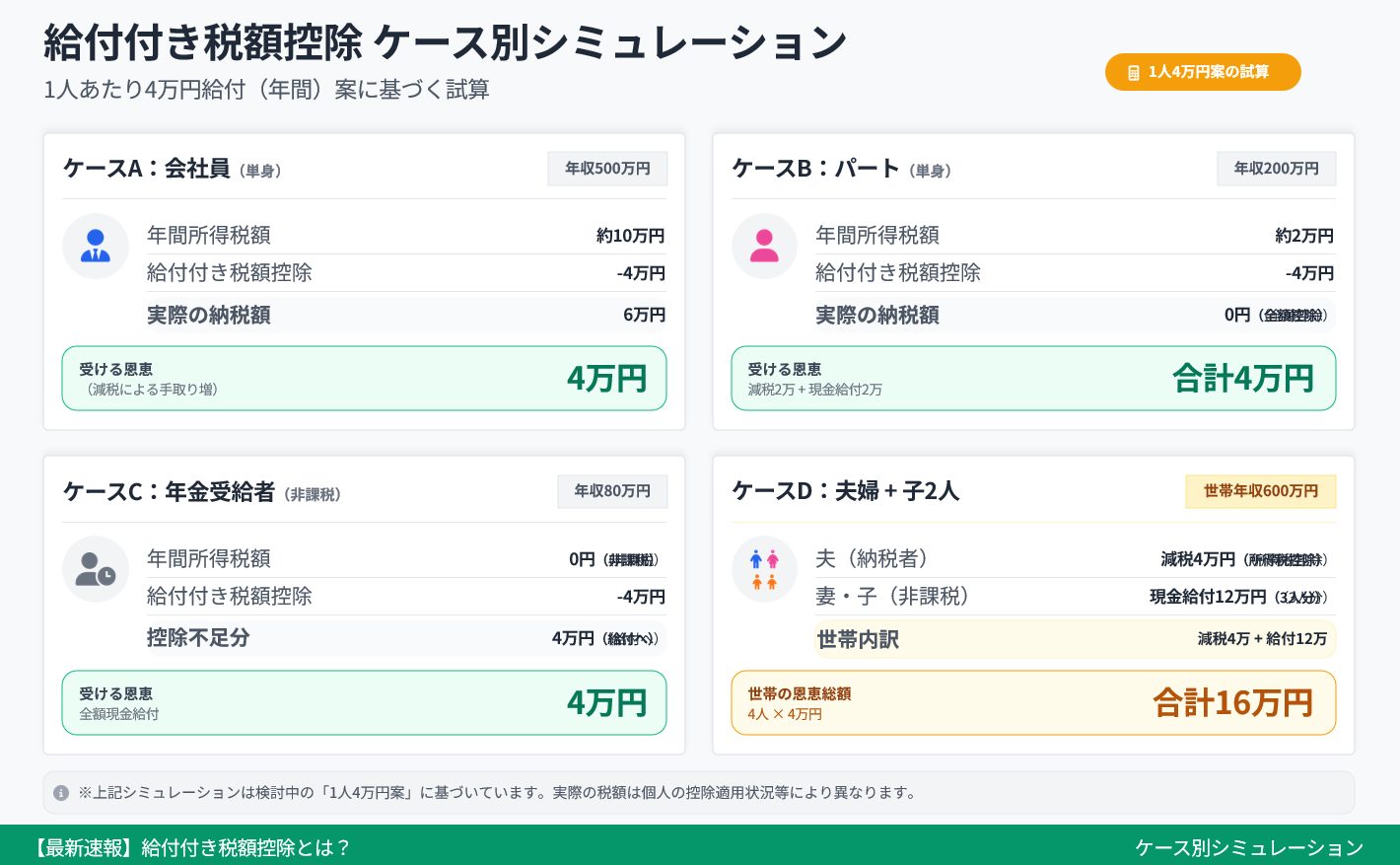 2024年に実施された定額減税(1人4万円)は、あくまで一時的な措置でした。給付付き税額控除は、これを恒久的な制度として確立するものです。
