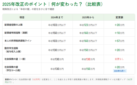 2025年改正のポイント|何が変わった?(比較表) 公開日: 2025.11.27 最終更新日: 2025.11.27 こちらの画像は、下記の記事で詳しく解説しています↓ 【2025年版】年収別手取り早見表|配偶者控除123万円・所得税160万円の新制度完全ガイド LINE友達に追加