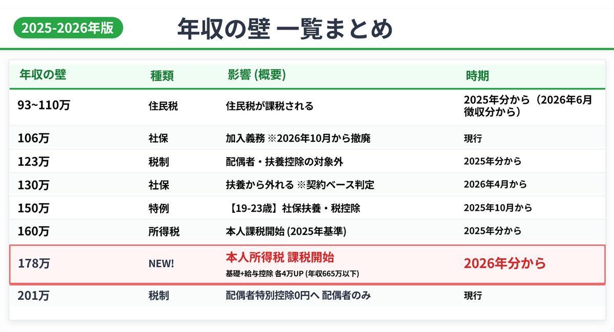 まずは、2025-2026年に適用される「年収の壁」を一覧で確認しましょう。