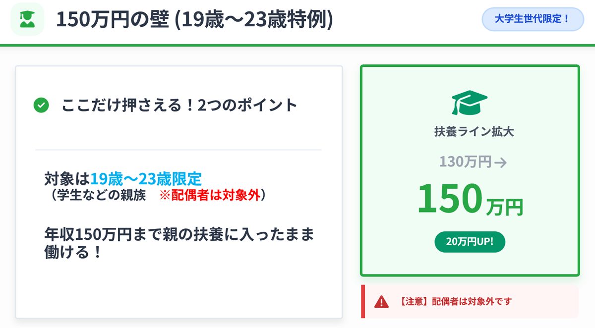 | 150万円 | 社会保険・税制(19-23歳限定) | 配偶者特別控除満額、19-23歳の被扶養者認定基準 | 2025年10月~(社保)、2025年12月~(税) | 大学生世代(19歳以上23歳未満)のみ適用 |