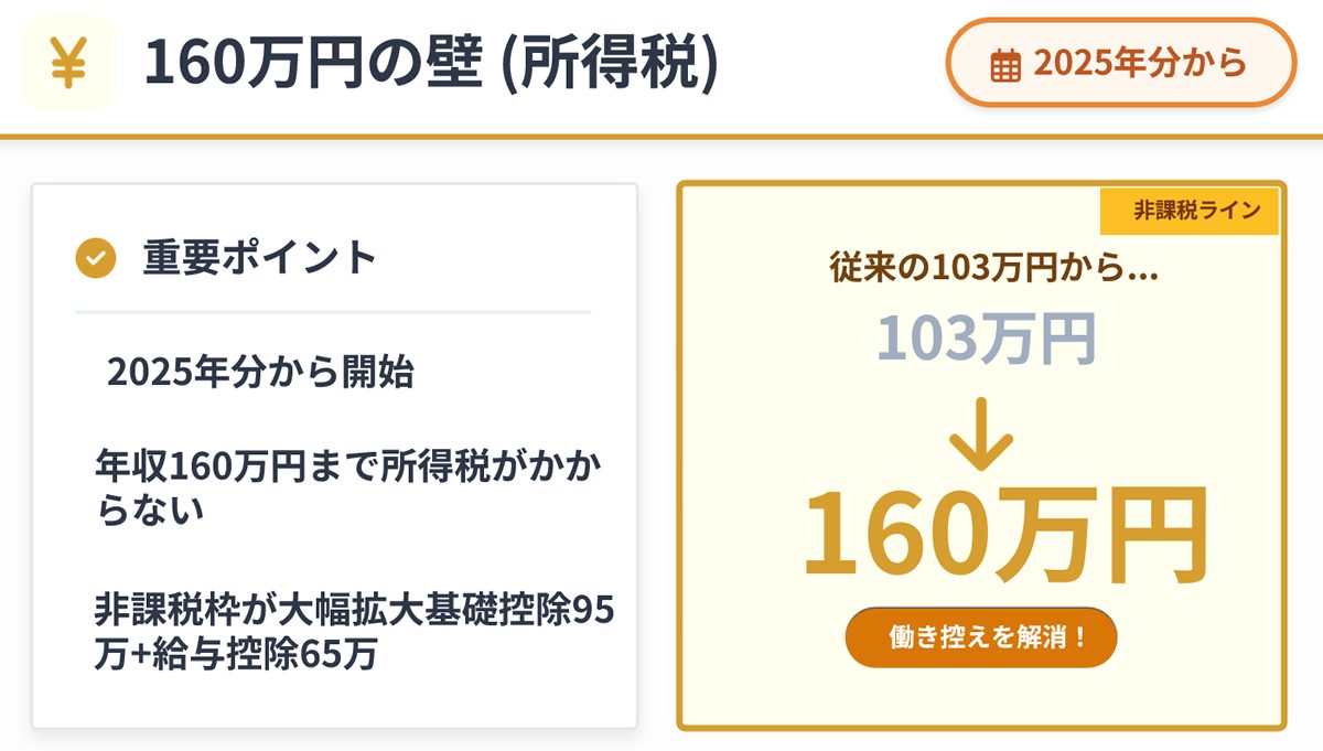 | 160万円 | 所得税(本人) | 本人に所得税が課税開始 | 2025年12月~ | 合計所得200万円以下:基礎控除95万円+給与所得控除65万円 |