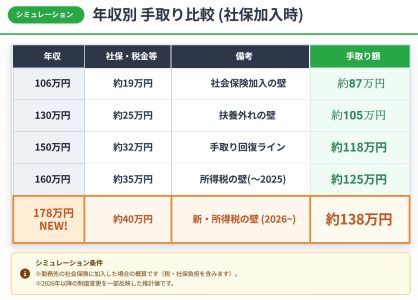 2025-2026年年収の壁完全ガイド|シミュレーション年収別手取り比較 (社保加入時)