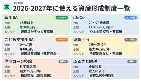 2026-2027年に使える資産形成制度一覧 公開日: 2026.01.01 最終更新日: 2026.01.01 こちらの画像は、下記の記事で詳しく解説しています↓ 【2026年版】「お金に弱いまま」を卒業!新NISA・iDeCo・手当「何からやる?」優先順位完全ガイド LINE友達に追加