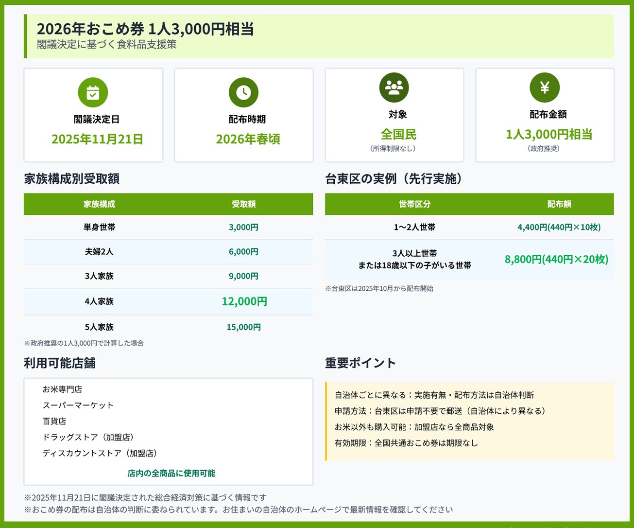 ⚠ 重要:おこめ券の配布は自治体の判断に委ねられているため、すべての自治体で実施されるとは限りません。