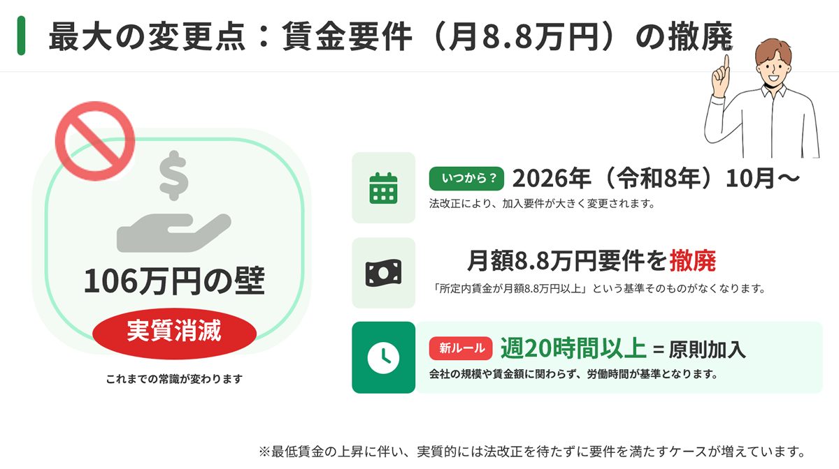 これまでの社会保険加入要件の一つに、「所定内賃金が月額8.8万円以上(年収約106万円)」という基準がありました。しかし、この基準は令和8年(2026年)10月を目途に撤廃されます。