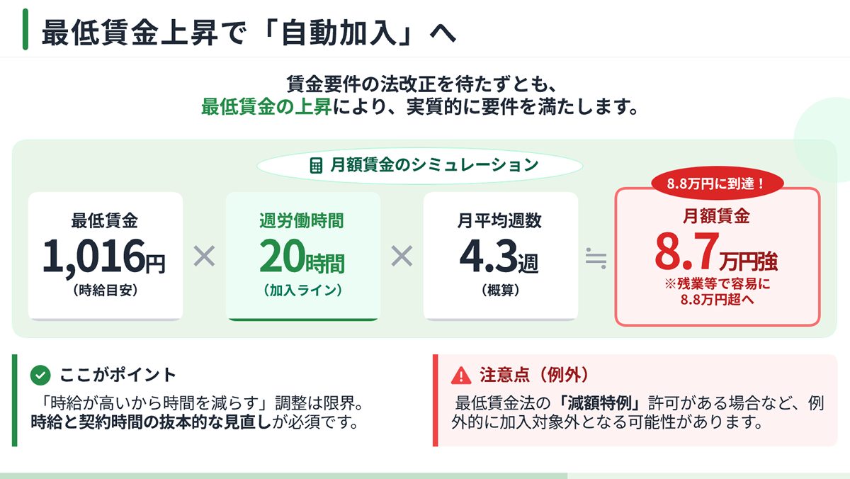 現在、すべての都道府県で地域別最低賃金が時給1,016円を超えた場合、週20時間以上働くと、計算上自動的に月額賃金は8.8万円を超えます。