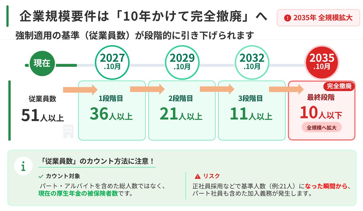 現在、社会保険の強制適用となるのは「従業員数51人以上」の企業です。しかし、この「企業規模要件」も段階的に引き下げられ、最終的には撤廃されます。小規模事業者の皆様は、以下のスケジュールを必ず把握し、資金繰りや労務管理の準備を進めてください。