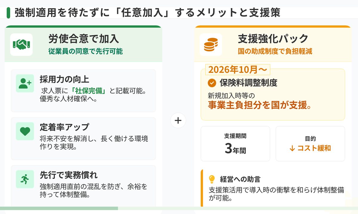- 強制適用を待たずに「任意加入」するメリットと支援策