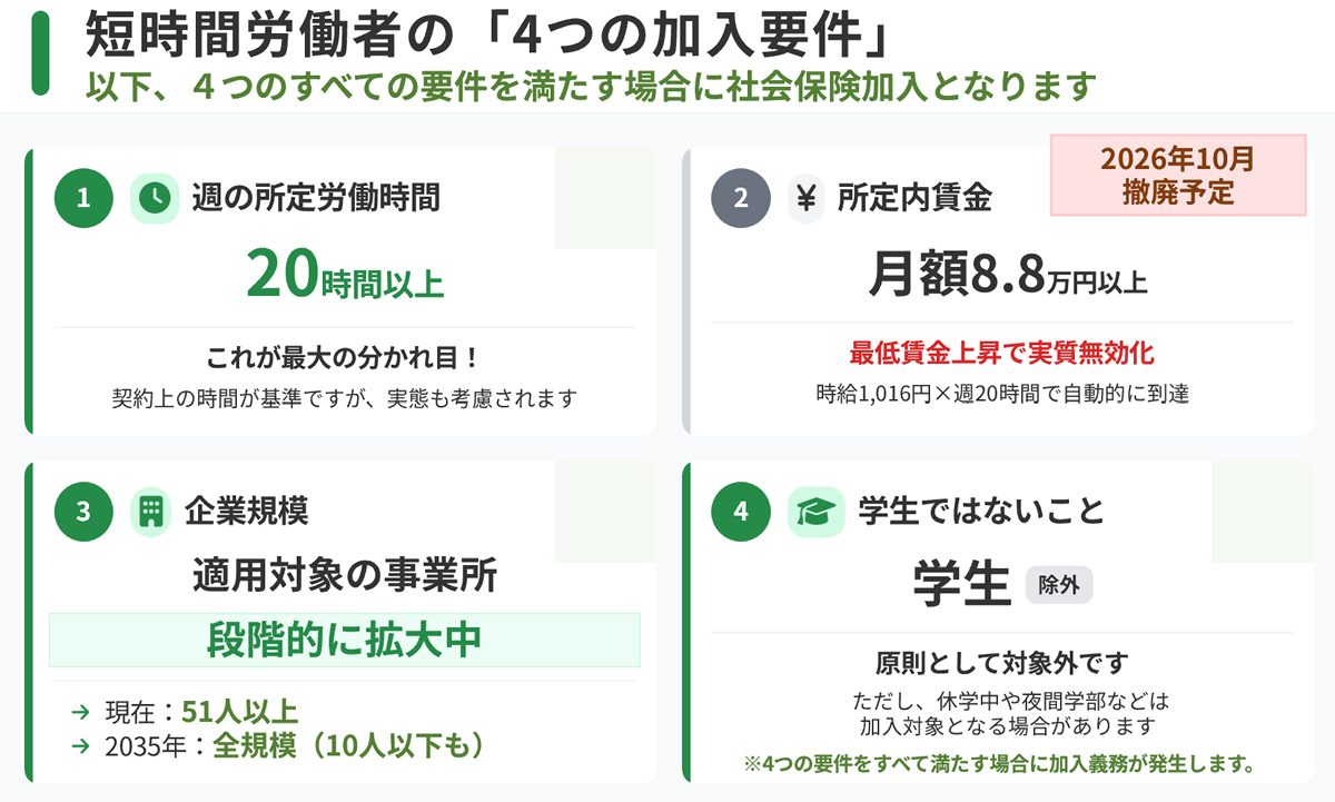 今後の社会保険加入の基準を整理します。短時間労働者が社会保険に加入する場合、次の4つの要件を全て満たす必要があります。