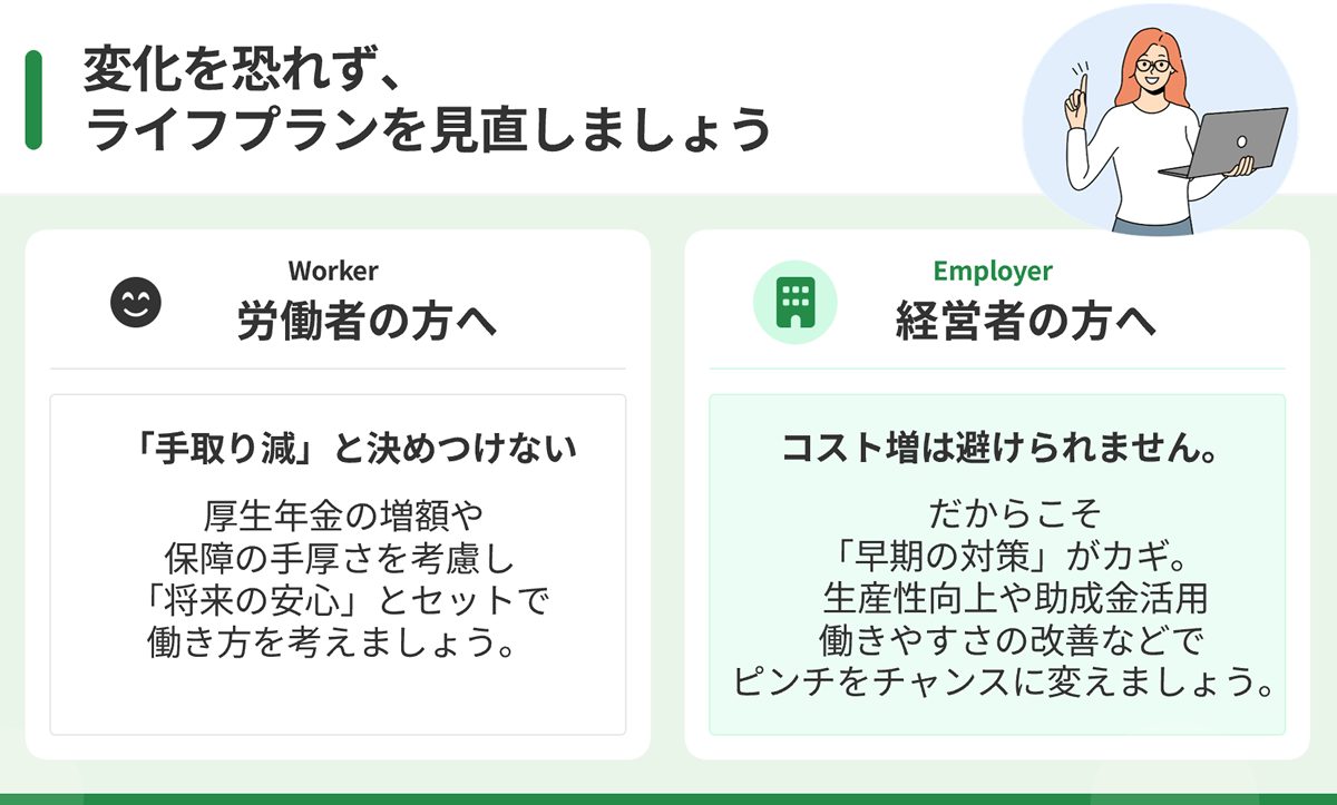 今回の法改正は、単なる「負担増」ではありません。厚生年金への加入は、将来受け取る年金額の増加や、傷病手当金・出産手当金といったセーフティネットの強化につながります。