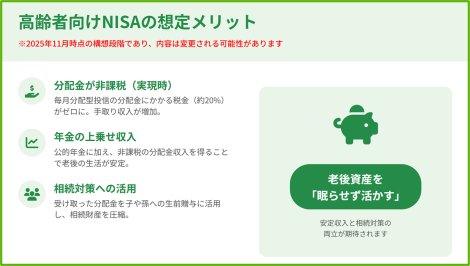 高齢者向けNISA(プラチナNISA)の想定されるメリット 公開日: 2025.12.10 最終更新日: 2025.12.10 こちらの画像は、下記の記事で詳しく解説しています↓ 高齢者向けNISA(プラチナNISA)とは?2026年度創設検討中の制度を税理士が解説 LINE友達に追加