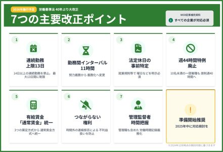 2026年労働基準法40年ぶり大改正|7つの主要改正ポイント 公開日: 2025.12.11 最終更新日: 2025.12.11 こちらの画像は、下記の記事で詳しく解説しています↓ 【完全解説】2026年労働基準法40年ぶり大改正|7つの主要改正ポイントと企業への影響 LINE友達に追加