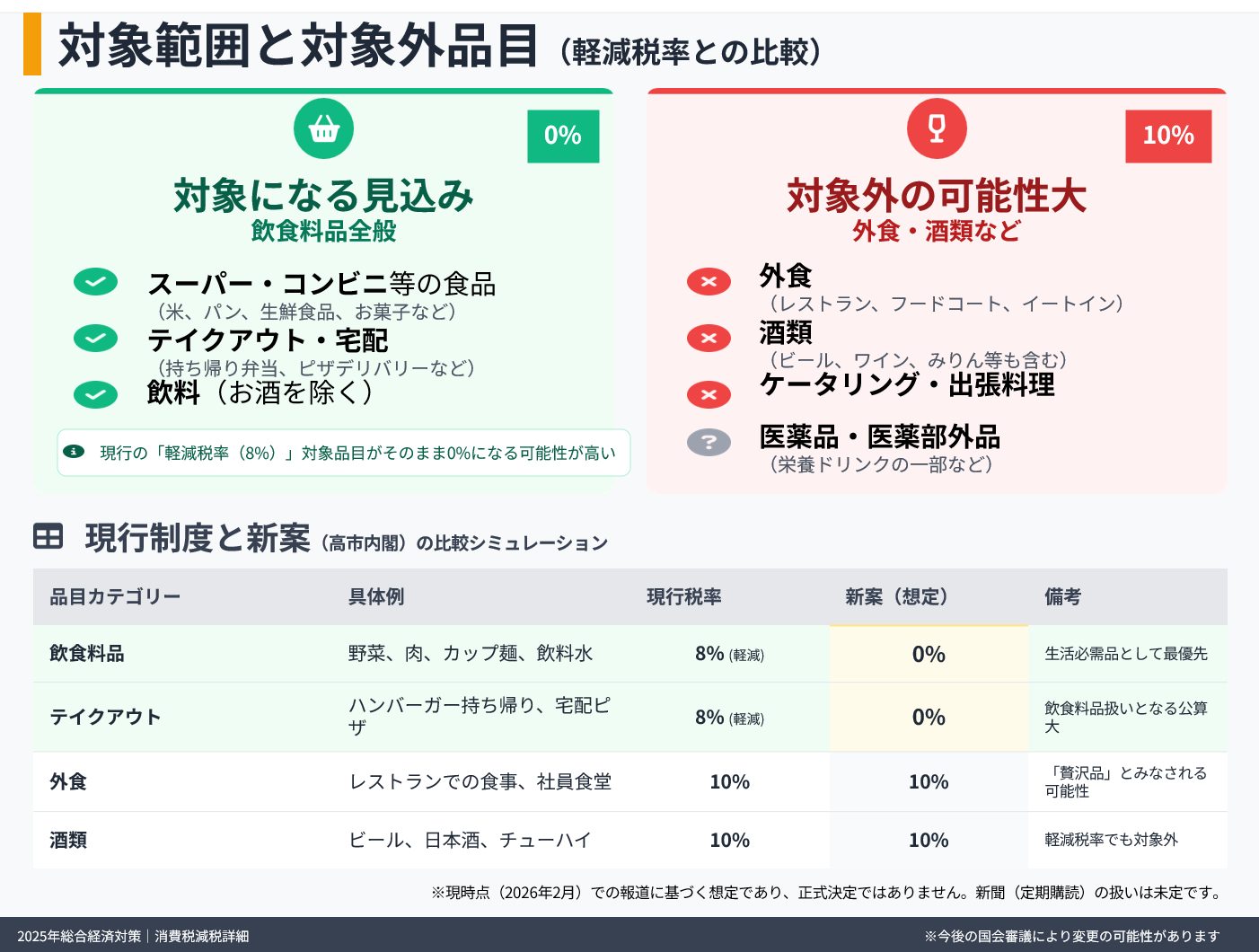 A2. 具体的な対象範囲はまだ正式発表されていません。現行の軽減税率と同様に、外食と酒類は対象外になる可能性が高いと考えられます。スーパーやコンビニで買う食料品は対象になる見込みです。