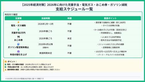 【2025年総合経済対策】2026年の児童手当・電気ガス・おこめ券・ガソリン現在スケジュール一覧