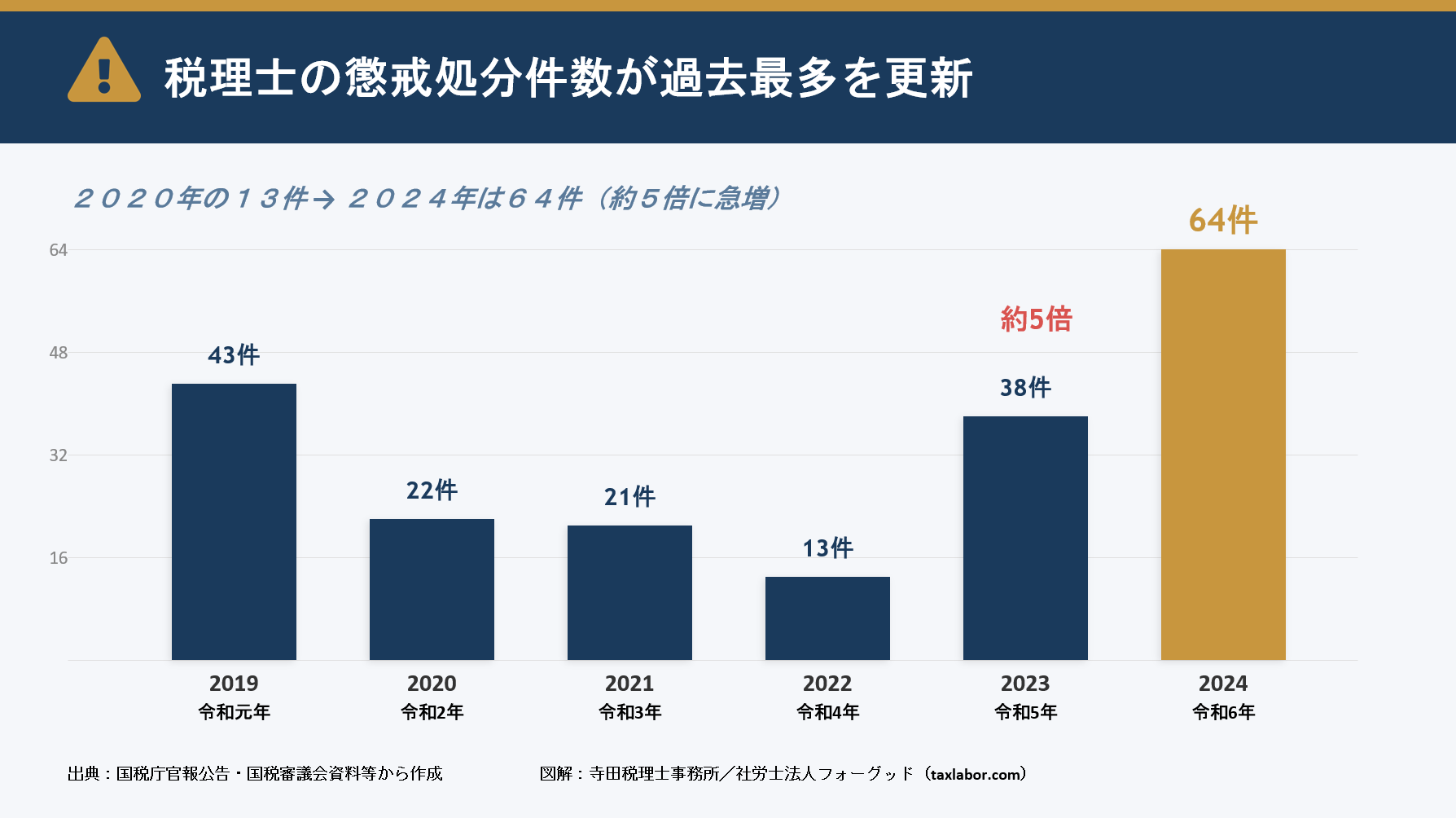 税理士・税理士法人の懲戒処分件数は、2020年の13件から2024年には64件へと約5倍に急増し、過去最多を記録しています。