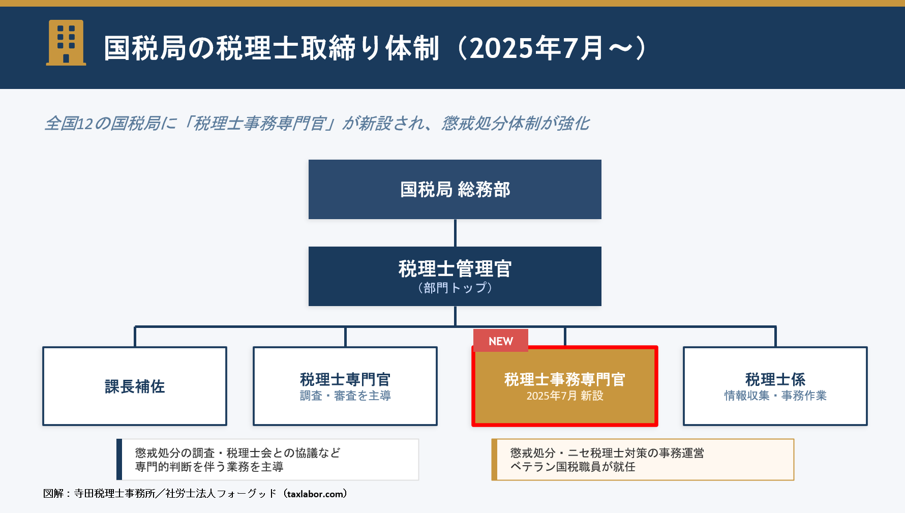 税理士を監督・取締まる部署は国税局の「総務部」で、トップの「税理士管理官」のもとに「課長補佐」「税理士専門官」が配置されており、2025年7月からここに「税理士事務専門官」が加わりました。