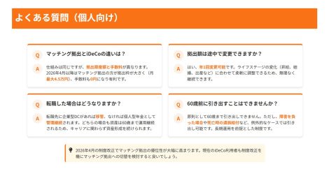 IDEDOマッチング拠出よくある質問|確定拠出年金制度改正 公開日: 2025.11.01 最終更新日: 2025.11.01 こちらの画像は、下記の記事で詳しく解説しています↓ 【個人向け】確定拠出年金2026年改正で何が変わる?|30秒でわかる診断 LINE友達に追加